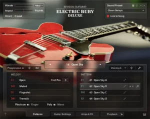 O que diferencia o Electric Ruby Deluxe são as camadas de realismo e controle de tonalidade. Além dos samples multiescala, o instrumento traz múltiplos sinais de captação (incluindo configurações estéreo com ribbon e condensador) e dois sinais DI separados, permitindo combinar timbres de pickup com cor acústica; tudo isso passa por uma cadeia de efeitos inspirada em amplificação vintage, stompboxes e recursos de estúdio para modelar desde limpidez cristalina até um overdrive arredondado. Para produtores que buscam textura analógica sem perder a praticidade, as predefinições e controles tornam rápido achar “o” som e ajustá-lo na mix.