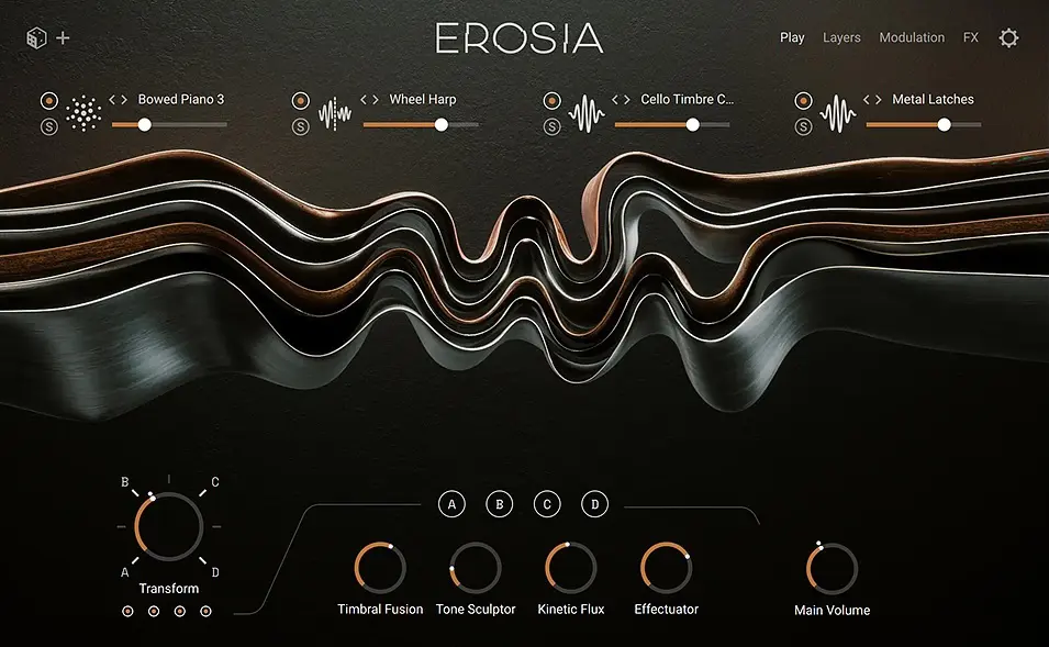 Tecnicamente, Erosia funciona numa engine de quatro camadas: a camada 1 é dedicada a um motor granular que anima texturas, enquanto as camadas 2 a 4 podem operar como sampler ou como wavetable, permitindo combinações híbridas entre realismo gravado e síntese evolutiva. Cada motor tem parâmetros próprios e fontes sonoras específicas, e é possível empilhar até quatro fontes simultâneas para criar timbres complexos e imprevisíveis. Para animar tudo isso, há um conjunto profundo de opções de modulação — envelopes, LFOs e sequenciadores — além de macros pensadas para moldar a evolução do som com poucos controles.
