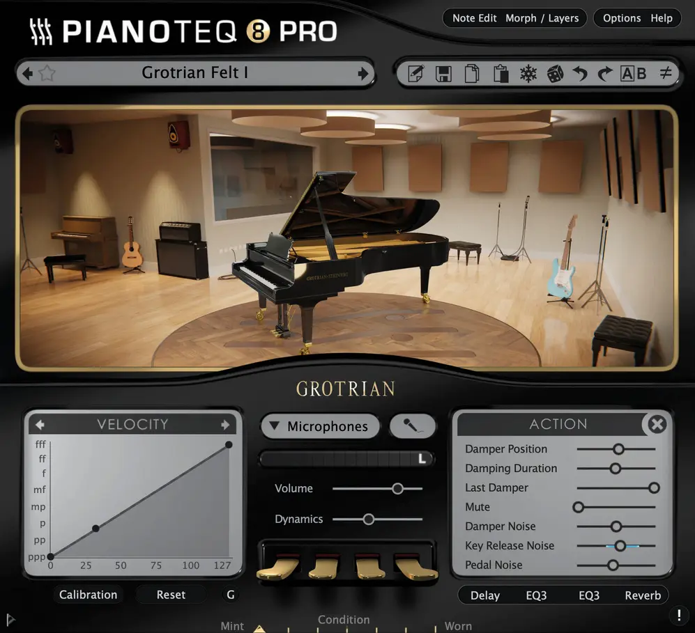 A edição na edição Pro é profundamente orientada para o design sonoro profissional. A versão Pro disponibiliza edição por nota com mais de 30 parâmetros (volume, detune, hammer hardness, strike point, duplex scale, entre outros), ferramentas de modelagem espectral que permitem mexer nos harmônicos de cada tecla, posicionamento de até cinco microfones virtuais e saída multicanal para mistura avançada. Também é possível fazer morphing e layering entre instrumentos, abrindo espaço para texturas inéditas e experimentação sonora no estúdio.